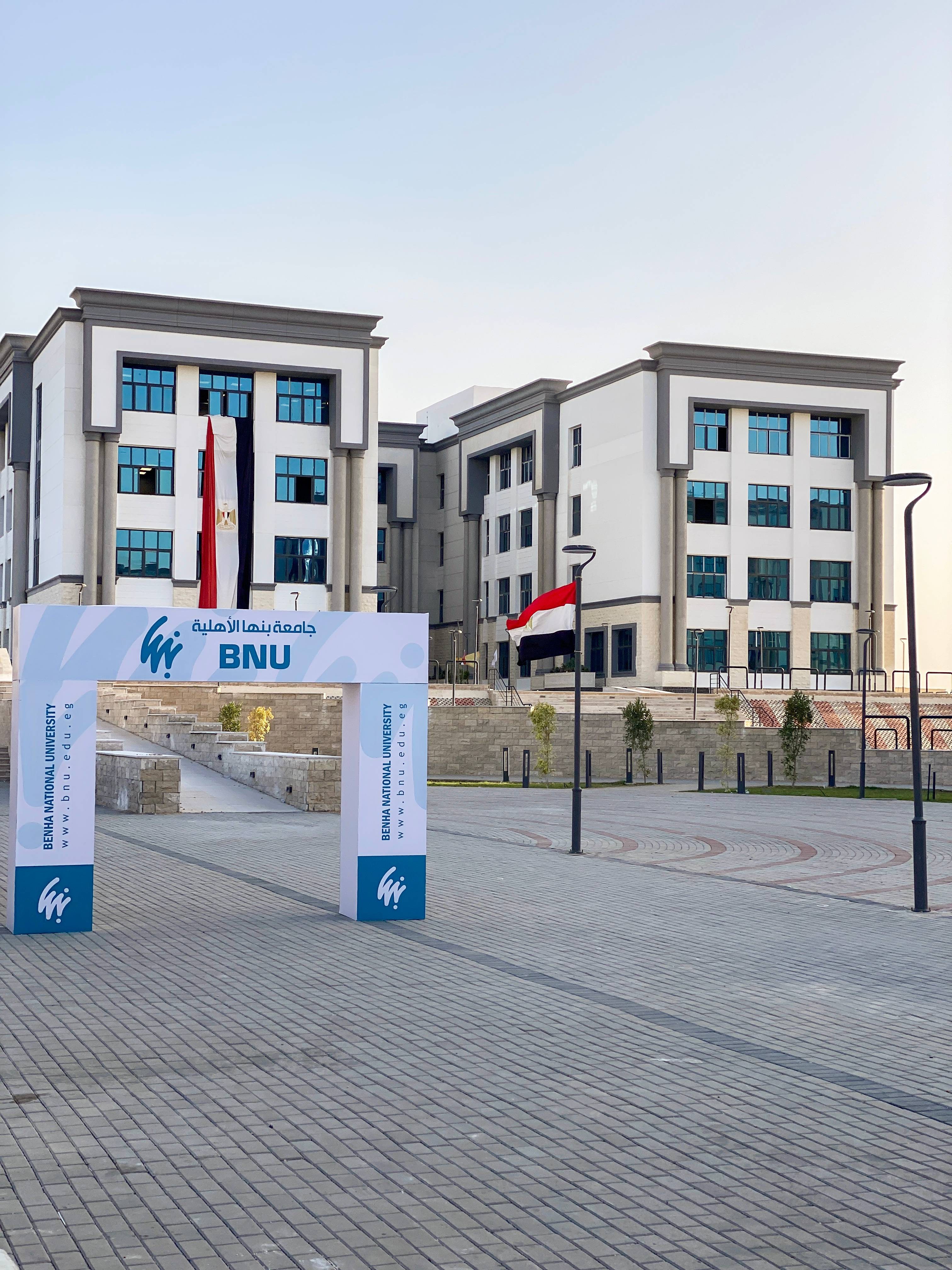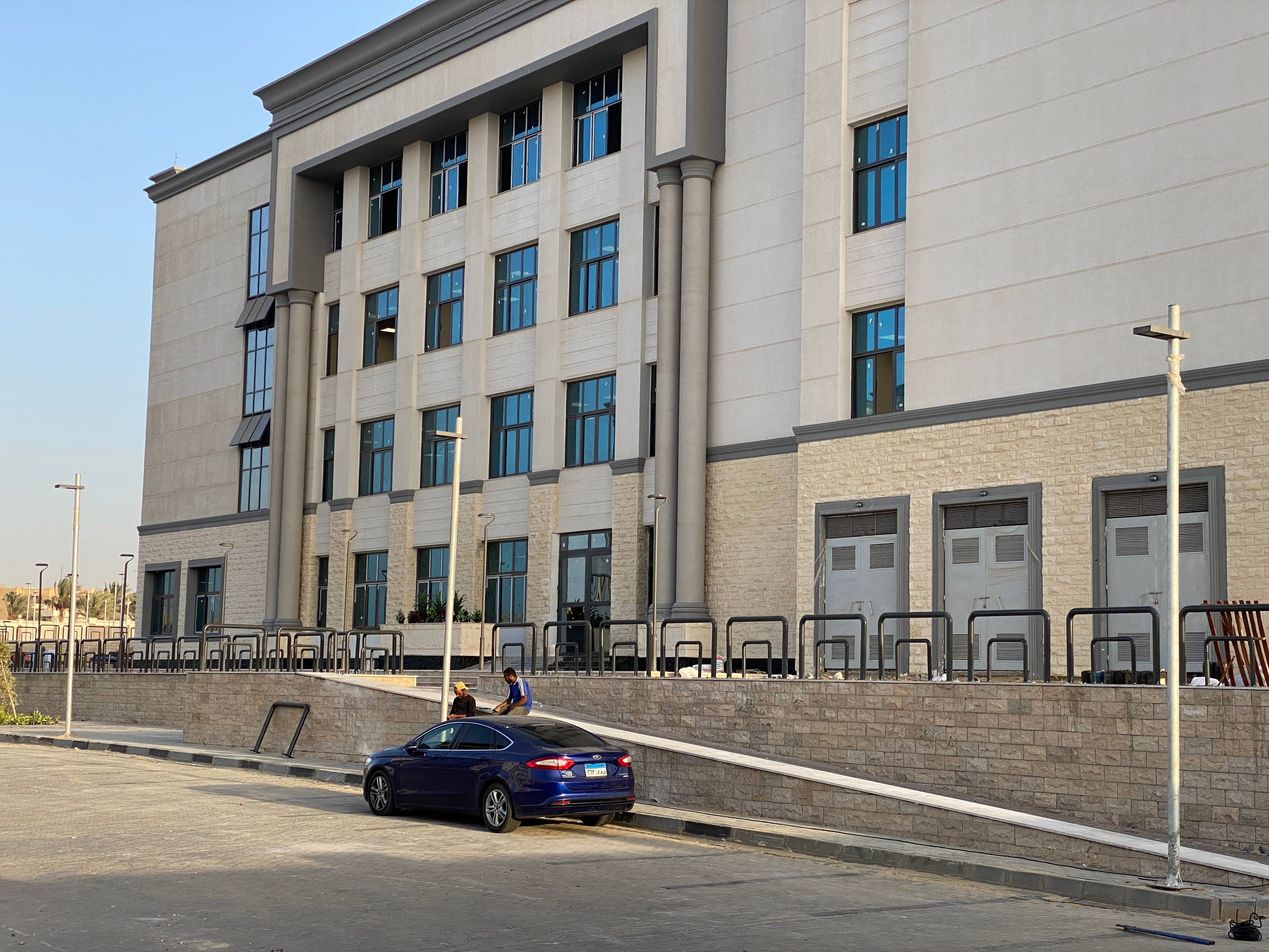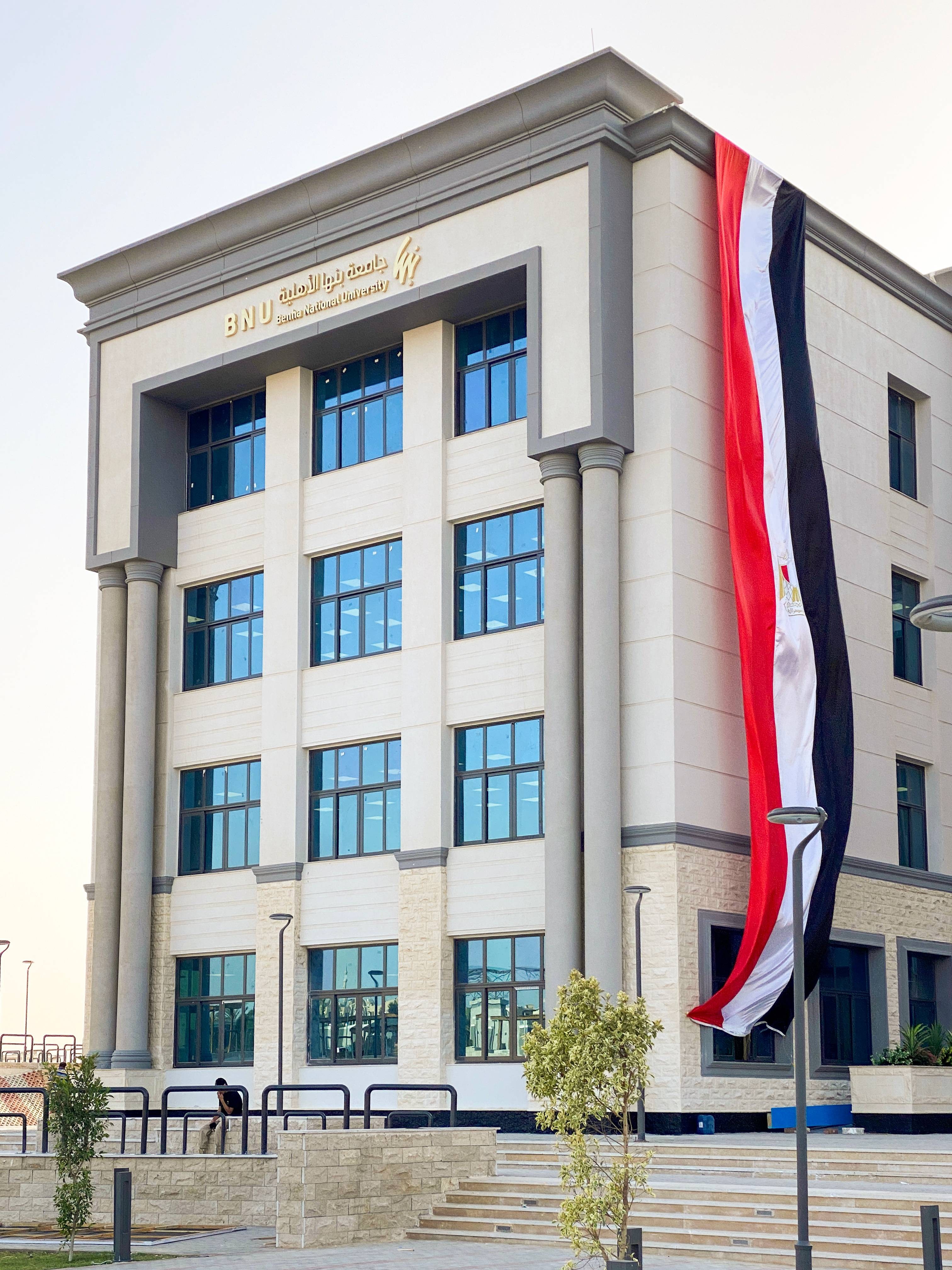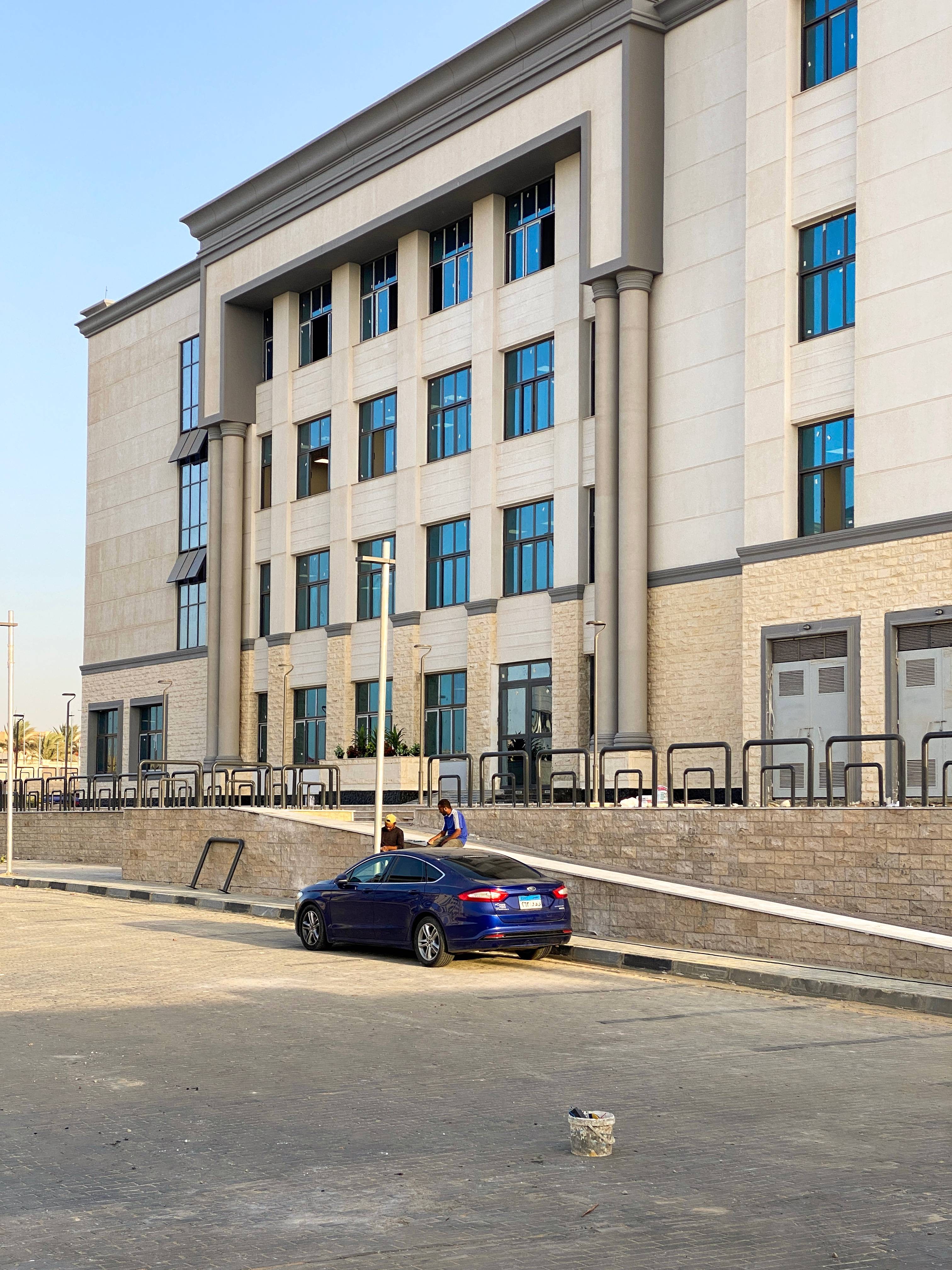 تم إختيار قطاع سوبر جامبو الجرار من إنتاج شركة مركز ماكينات ومستلزمات الألومينيوم ( شريف علي حسن ) لما يوفره من سلاسة في الإستخدام وإمكانية تغطية فتحات كبيرة تصل إلي أكثر من ثلاثة أمتار إلي جانب إمكانية دمجه مع القطاعات الثابتة سوناتا مما يحقق الرؤية التصميمية للمبني وكذلك تحقيق البعد الوظيفي للفتحة من إدخال الإنارة المناسبة إلي القاعات الدراسية. كما تم إختيار الزجاج المزدوج للحد من الضوضاء الخارجية والتخفيف من الأحمال الحرارية لتحقيق مناخ أفضل للدراسة.