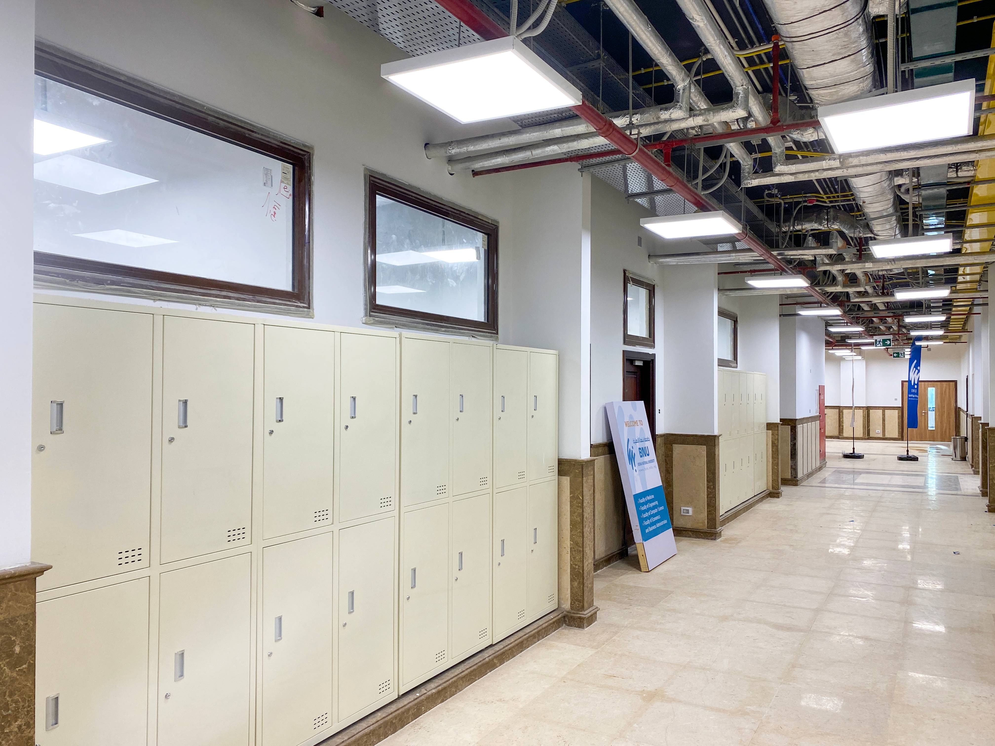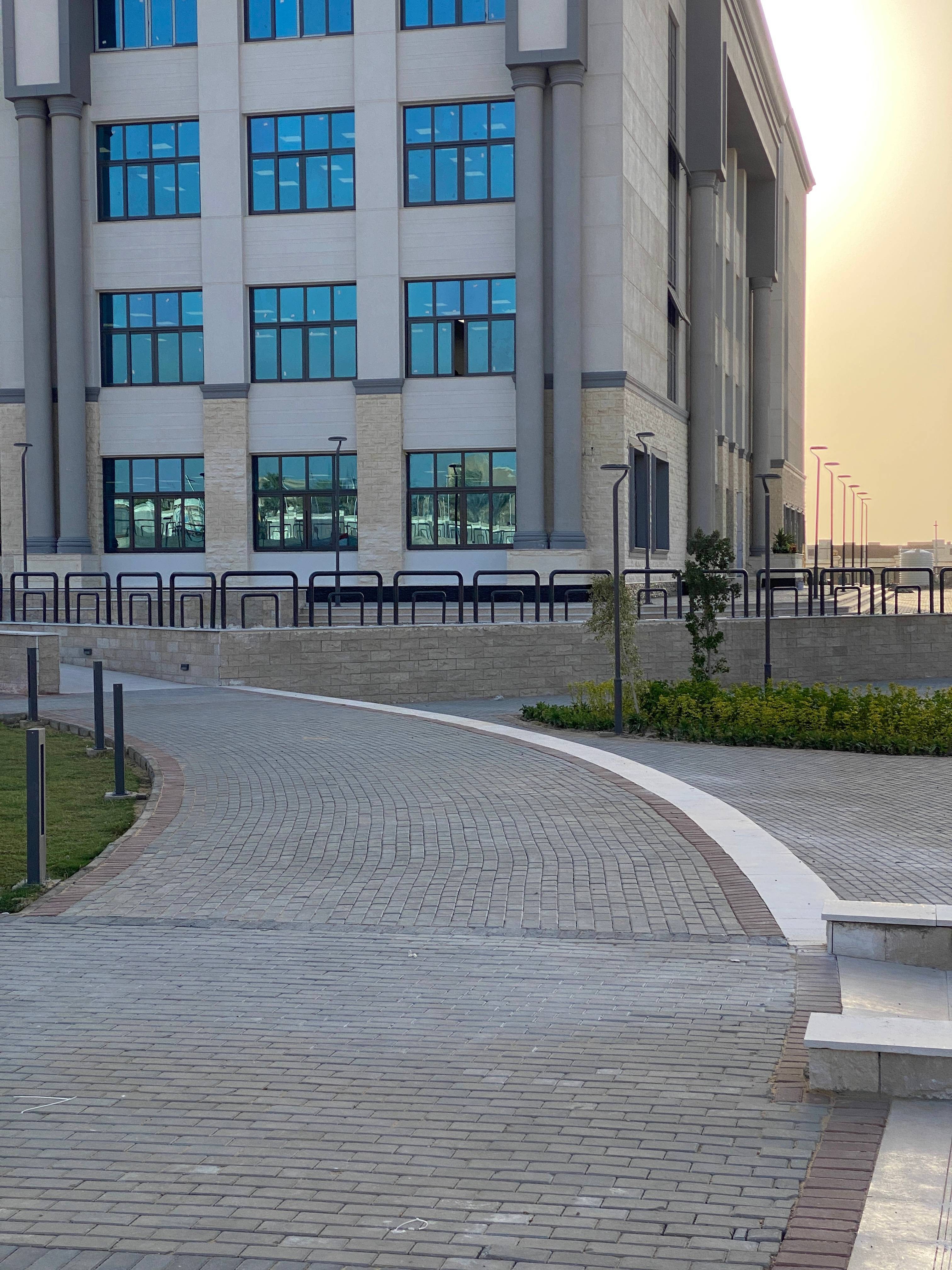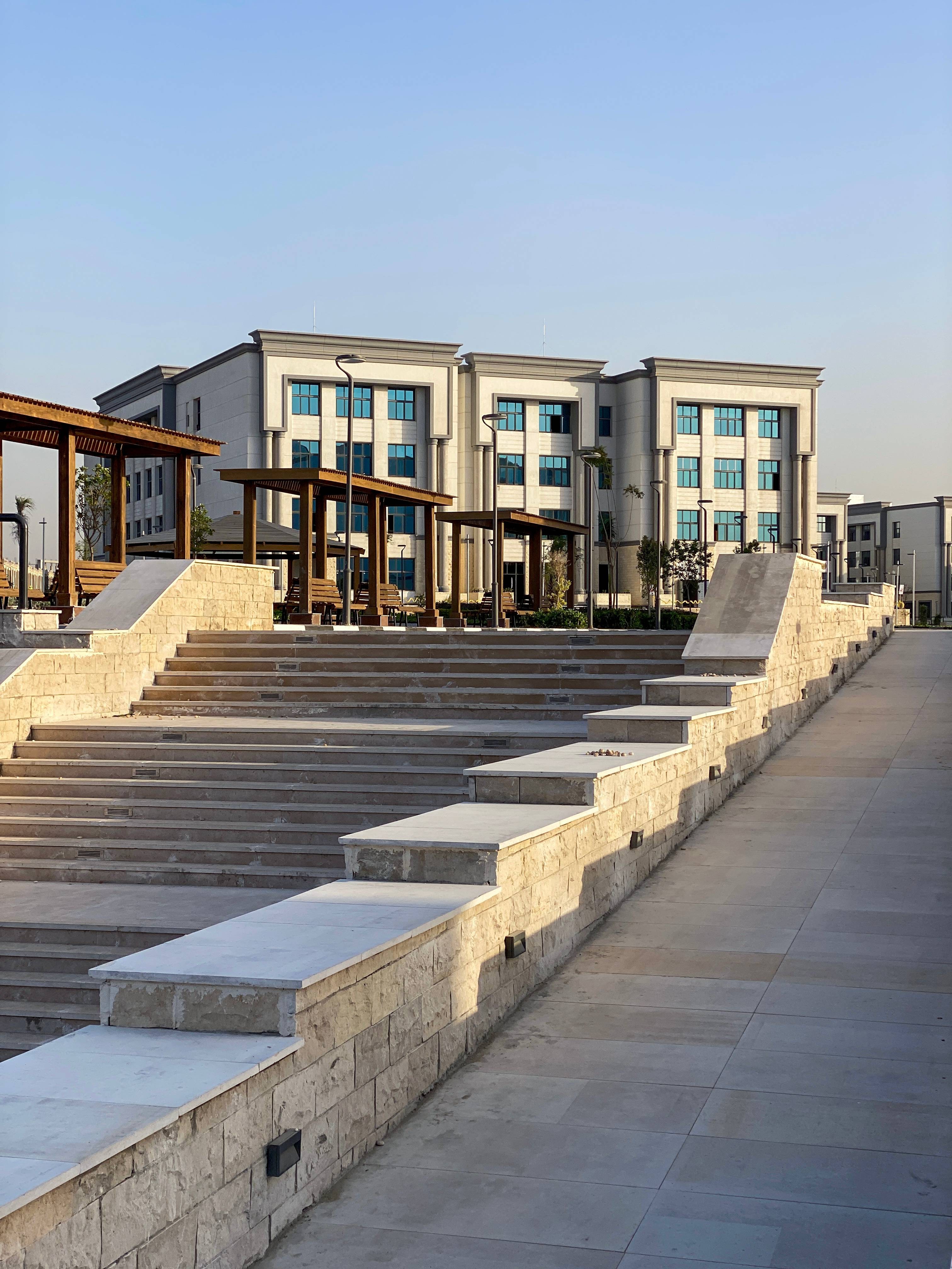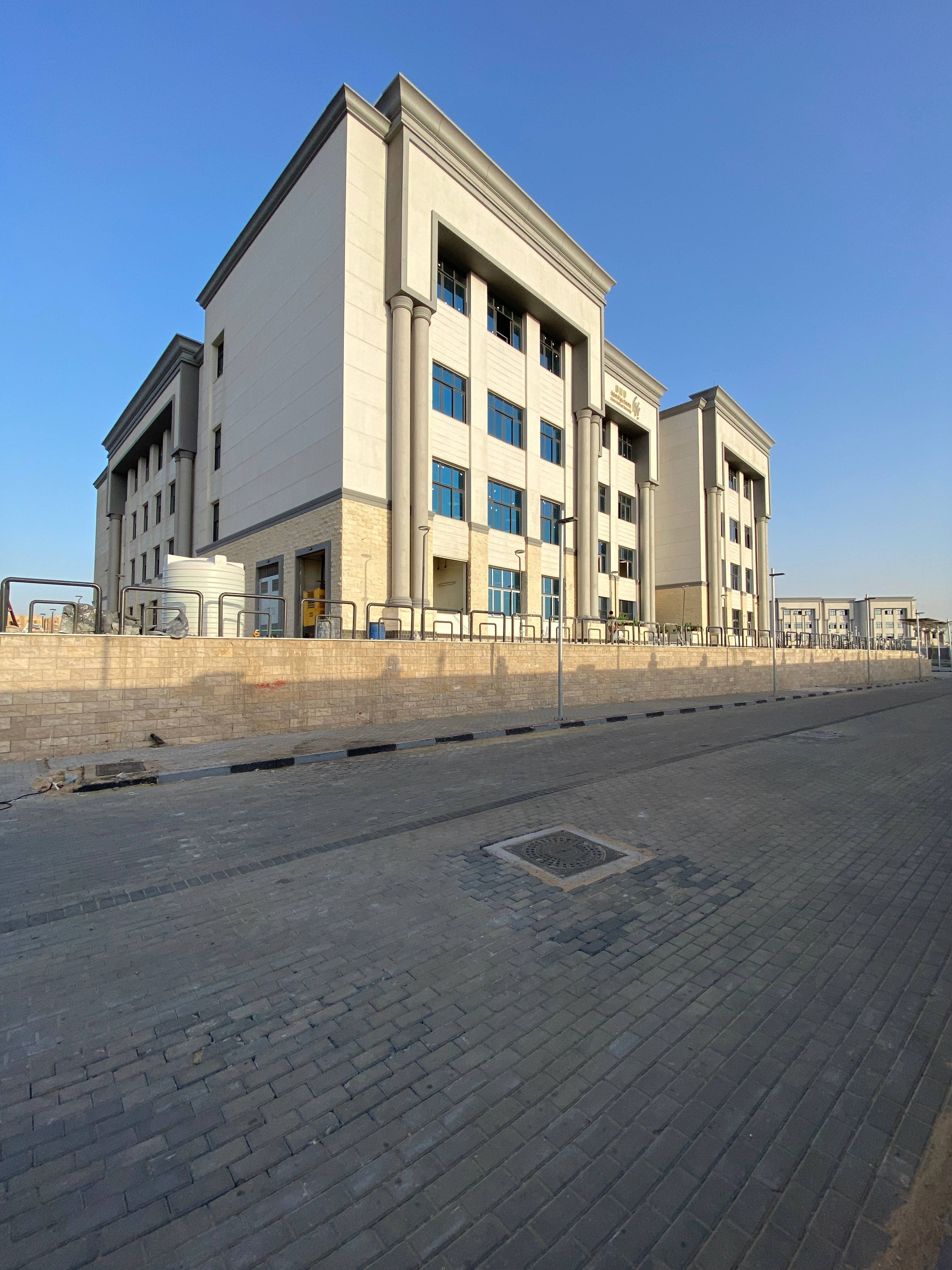 تم إختيار قطاع سوبر جامبو الجرار من إنتاج شركة مركز ماكينات ومستلزمات الألومينيوم ( شريف علي حسن ) لما يوفره من سلاسة في الإستخدام وإمكانية تغطية فتحات كبيرة تصل إلي أكثر من ثلاثة أمتار إلي جانب إمكانية دمجه مع القطاعات الثابتة سوناتا مما يحقق الرؤية التصميمية للمبني وكذلك تحقيق البعد الوظيفي للفتحة من إدخال الإنارة المناسبة إلي القاعات الدراسية. كما تم إختيار الزجاج المزدوج للحد من الضوضاء الخارجية والتخفيف من الأحمال الحرارية لتحقيق مناخ أفضل للدراسة.