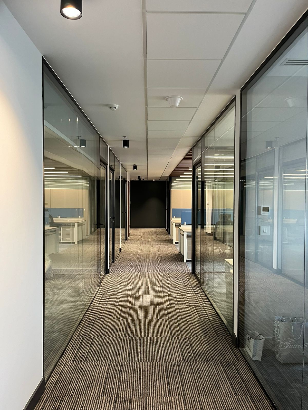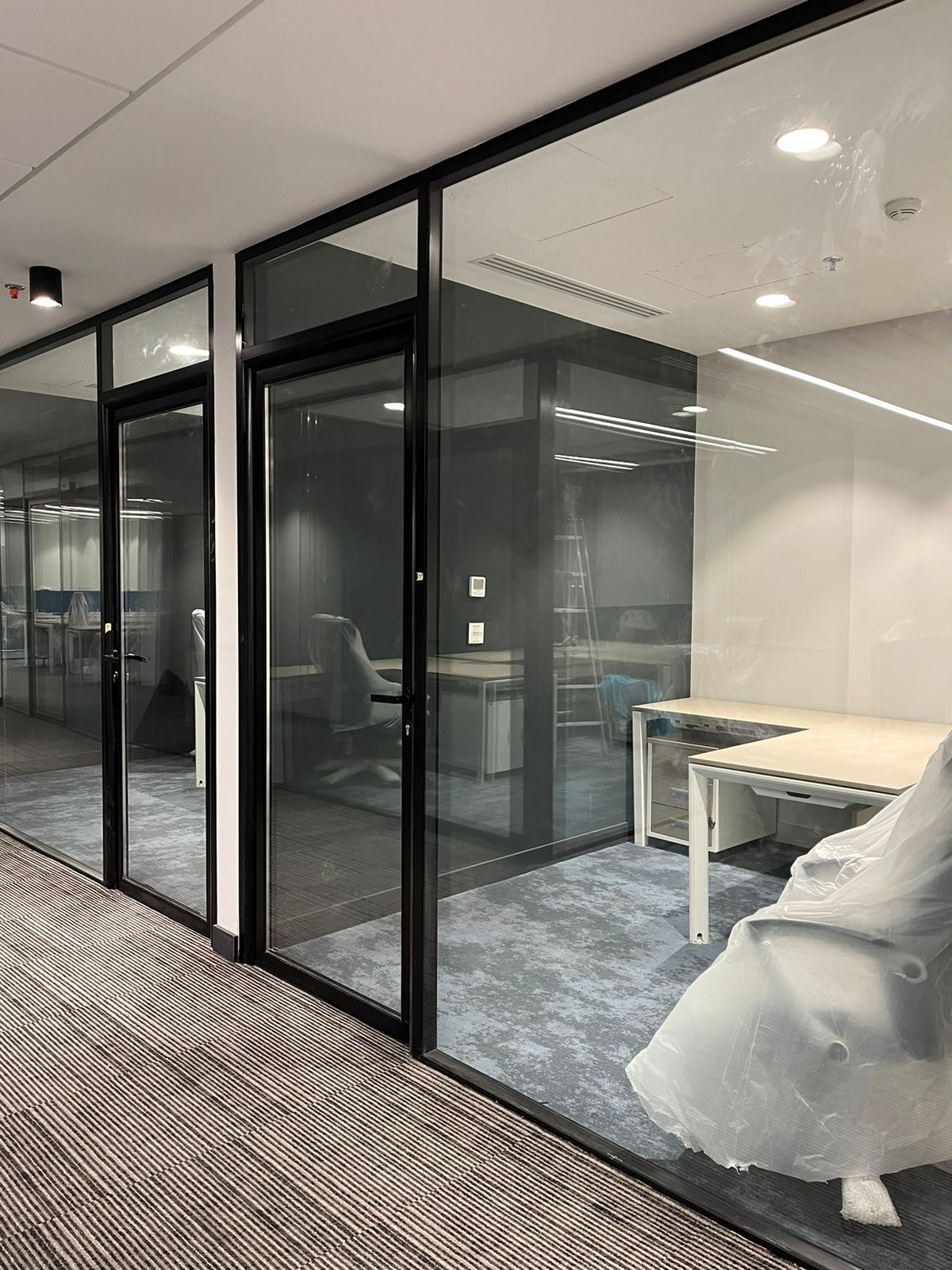 تآتي الجدران الزجاجية لتقسيم الفراغات الداخلية بأشكال وأنواع عديدة، تشترك كلها في الاناقة و الحداثة. ولّى زمن الشبابيك الخشبية والغرف المغلقة، و حيث أن التوجه الحالي في التصميم المعماري يميل أكثر إلي المساحات المفتوحة التي تخلق احساساً بالشفافية و الإنفتاح والرحابة، فقطاعات الألومينيوم  Alumil P100 slim توفر الحل المثالي للخصوصية مع الإحتفاظ بإحساس الإنفتاح والرحابة نظرا لصغر حجم القطاعات والمرونة في التصميم والتشغيل بالموقع.