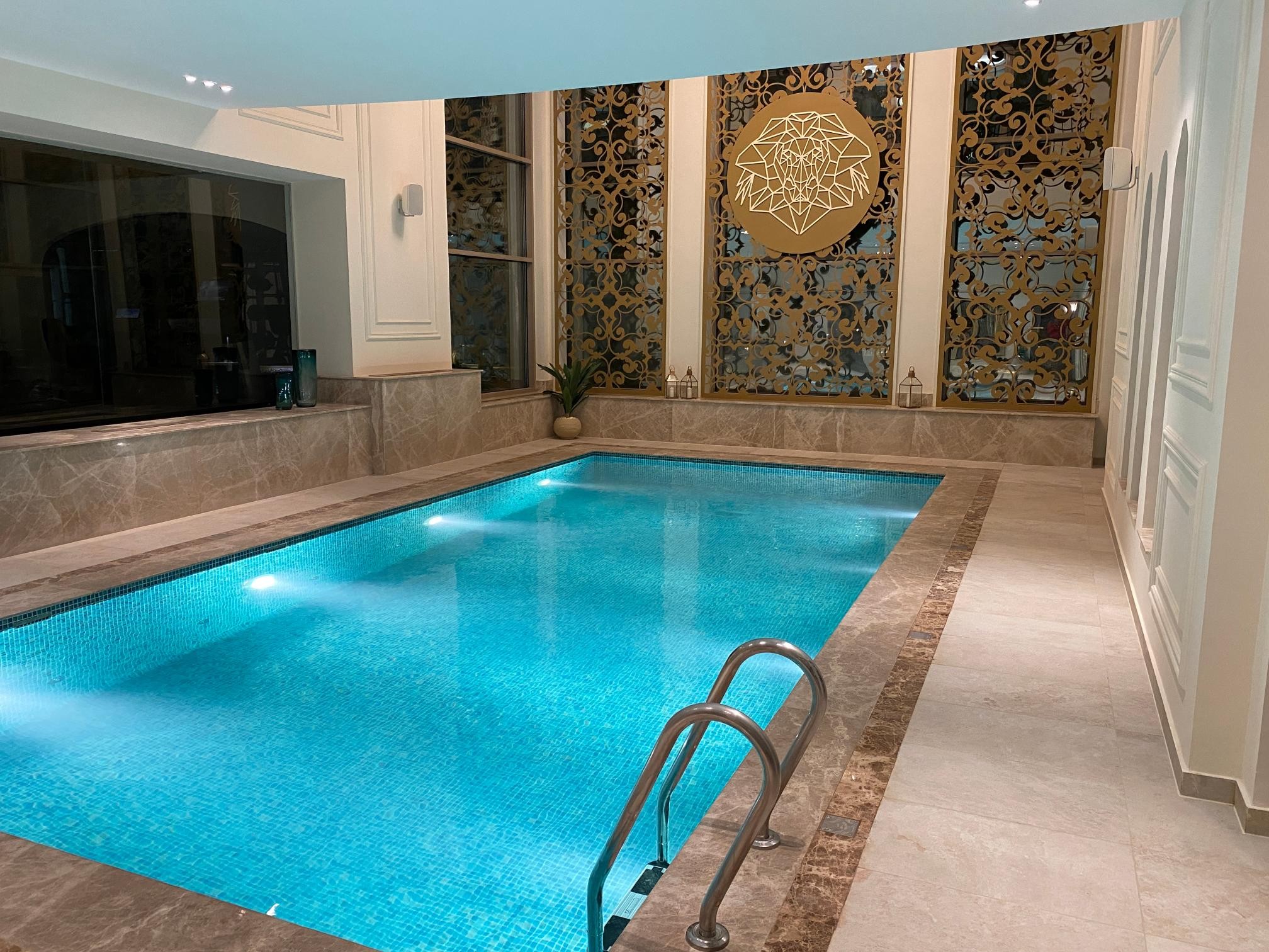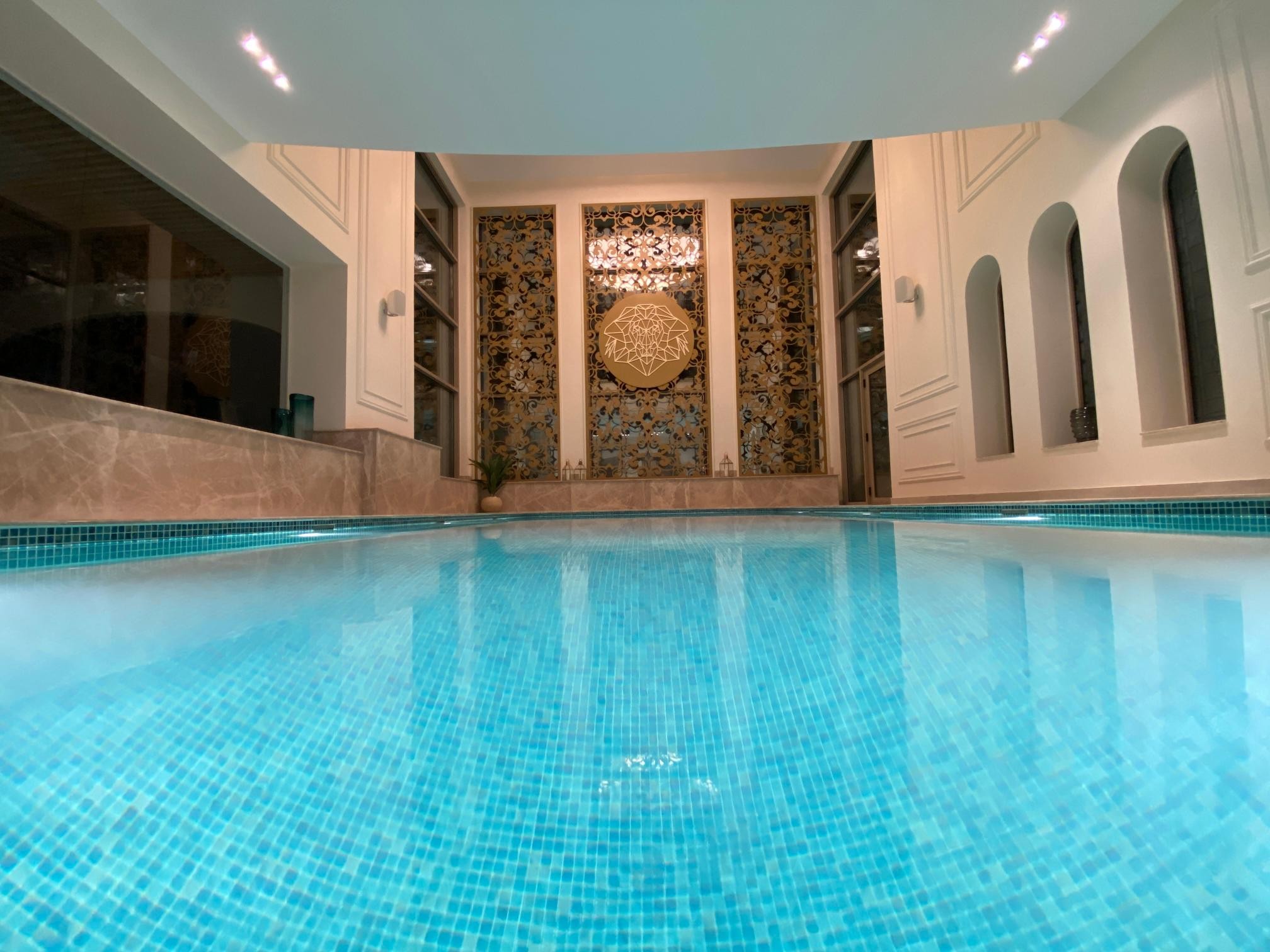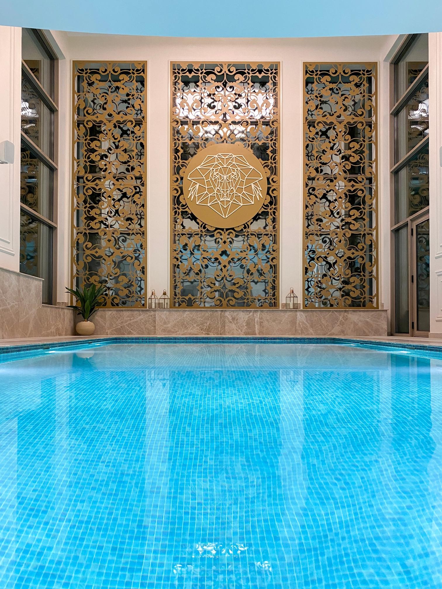 قامت ألومين بتنفيذ المتطلبات الخاصة بتصميم وتنفيذ فتحات المبني الخاص بالمسبح الداخلي باستخدام قطاعات بانوراما انتاج شركة شريف علي حسن الخاصة بالواجهات الزجاجية (Panorama 52) كما تم استكمال التصميم باستخدام ألواح الألومينيوم المفرغة باستخدام ماكينة التقطيع والتفريغ CNC